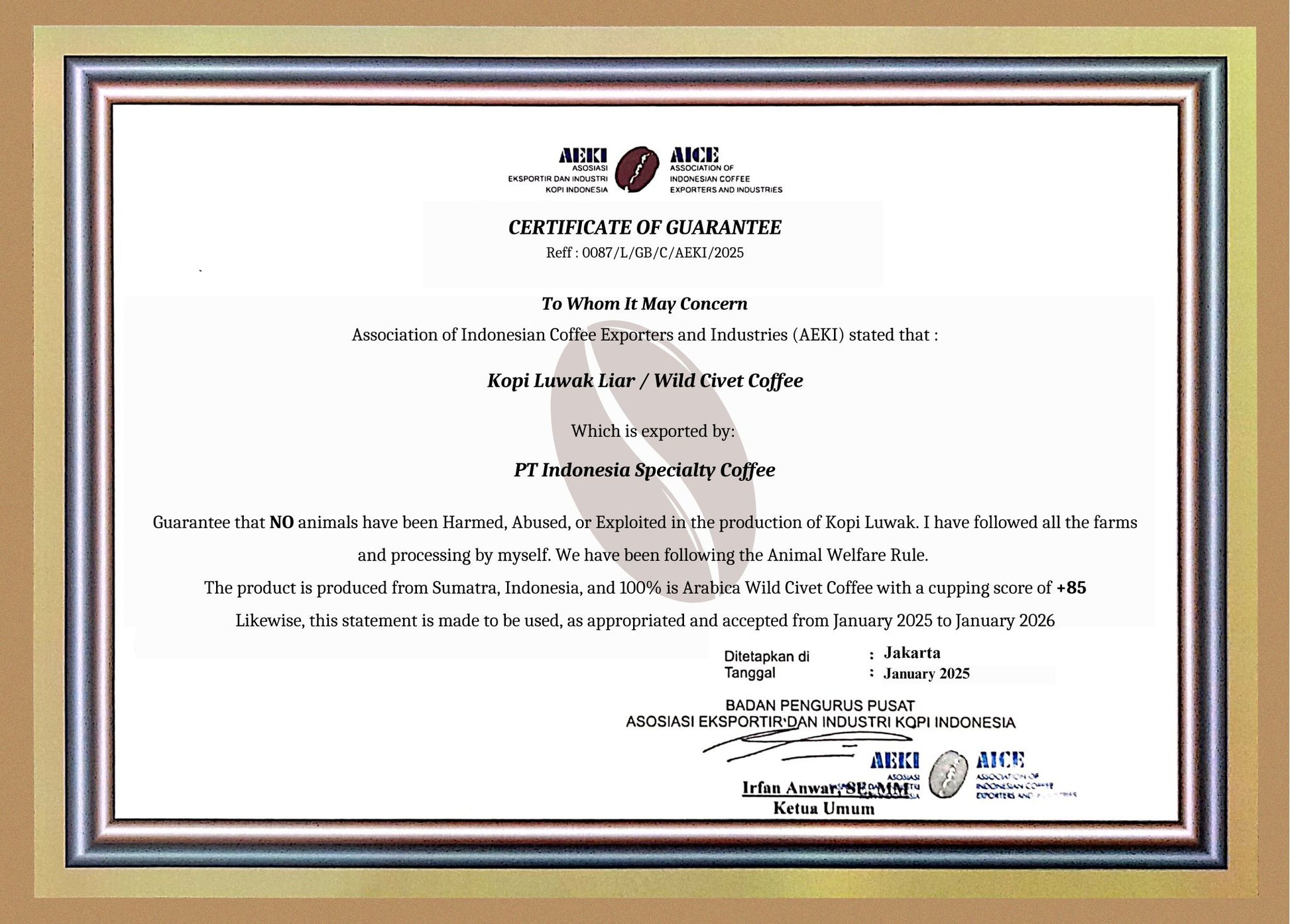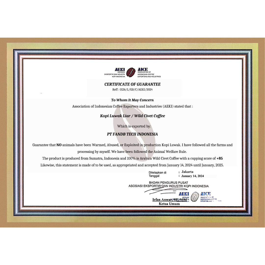 A MUST TRY (AT LEAST) ONCE COFFEE!! Fully certified, our Kopi Luwak coffee beans come from fully trusted farms where the Civet cats are treated with kindness and freedom.